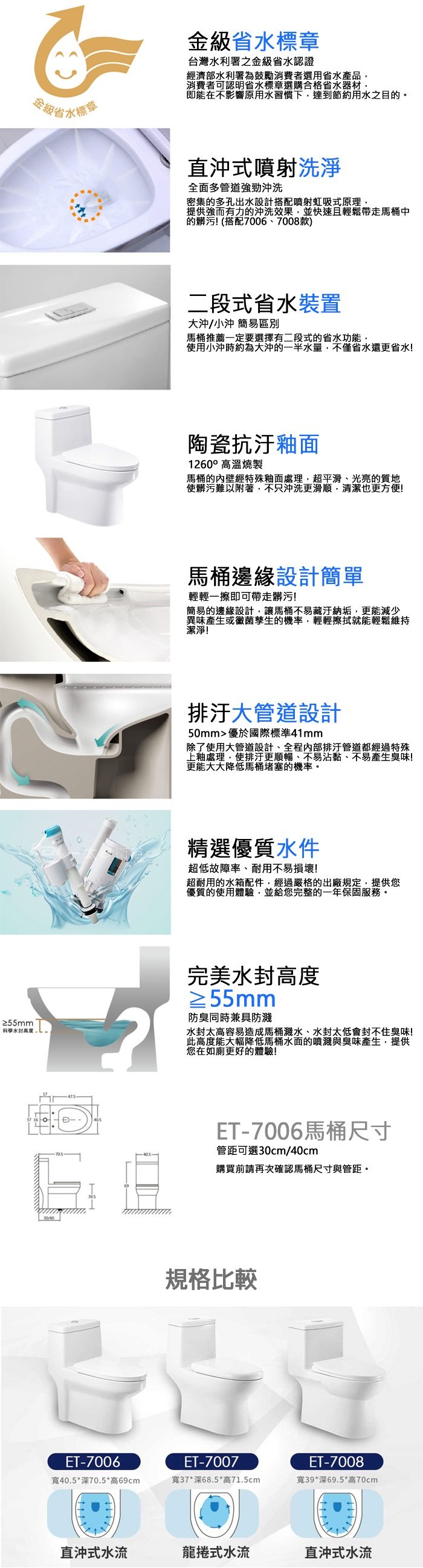 ◆ 型號:ET-7006(噴射虹吸式-金級省水馬桶)X1入