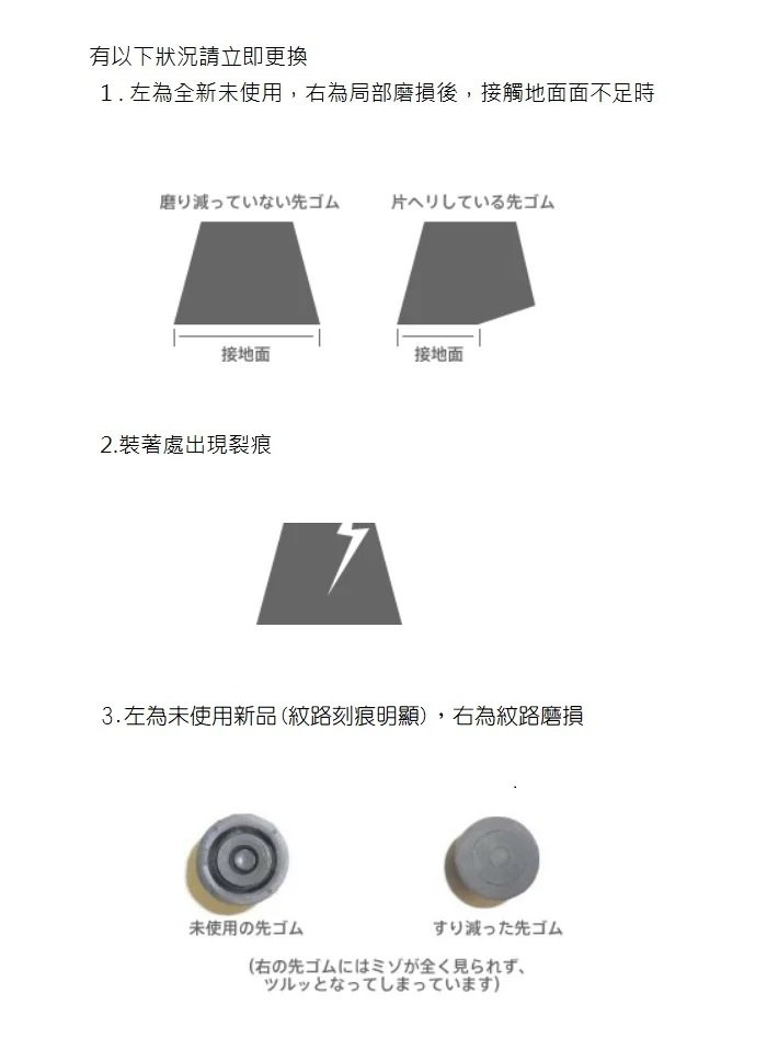 ◆ 拐杖於接觸地面時 肩膀的受力約為自體體重的三倍 此橡膠頭加裝於拐杖前端 可減緩衝擊保護手部 關結及肩膀