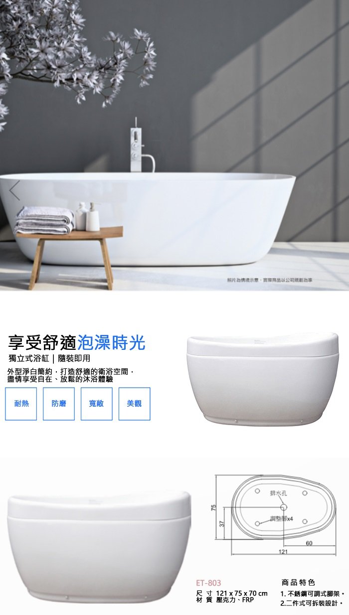 搶先評價 “【海夫健康生活館】ITAI一太 浴缸系列 淨白簡約大空間 雙層獨立式浴缸(ET803)” 取消回覆