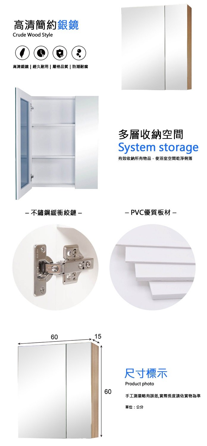 ◆ 材質:銀鏡+優質PVC發泡板材+不鏽鋼緩衝鉸鏈