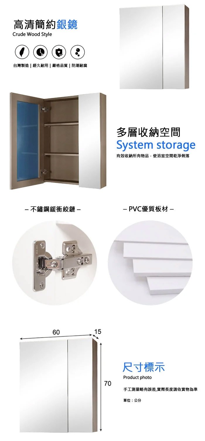 ◆ 材質:銀鏡+優質PVC發泡板材+不鏽鋼緩衝鉸鏈
