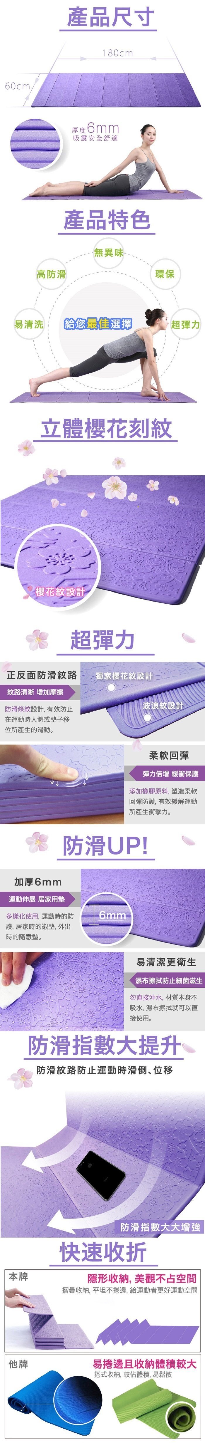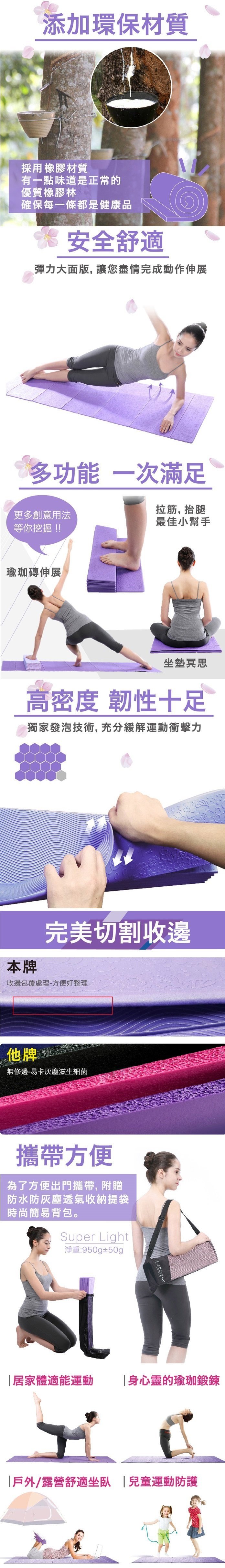 產品規格: ◆ 本體尺寸:180cm*60cm,6mm厚 ◆ 本體重量:約1.2kg ◆ 產品材質:TPE(熱可塑性彈性體)/EVA(聚乙烯醋酸乙烯酯) / 橡膠 ◆ 製造國別:台灣 ◆ 產品配件:透氣收納袋