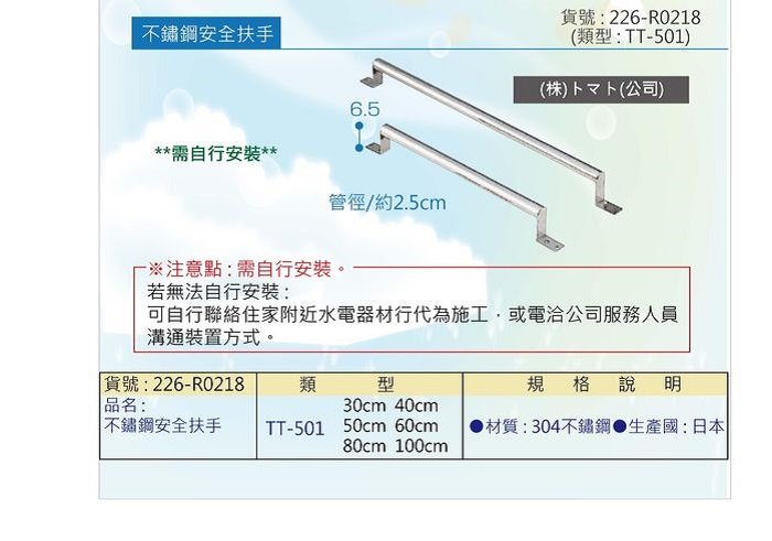 產品特性: ◆ 不鏽鋼安全扶手 ◆ 日本製造 品質有保障