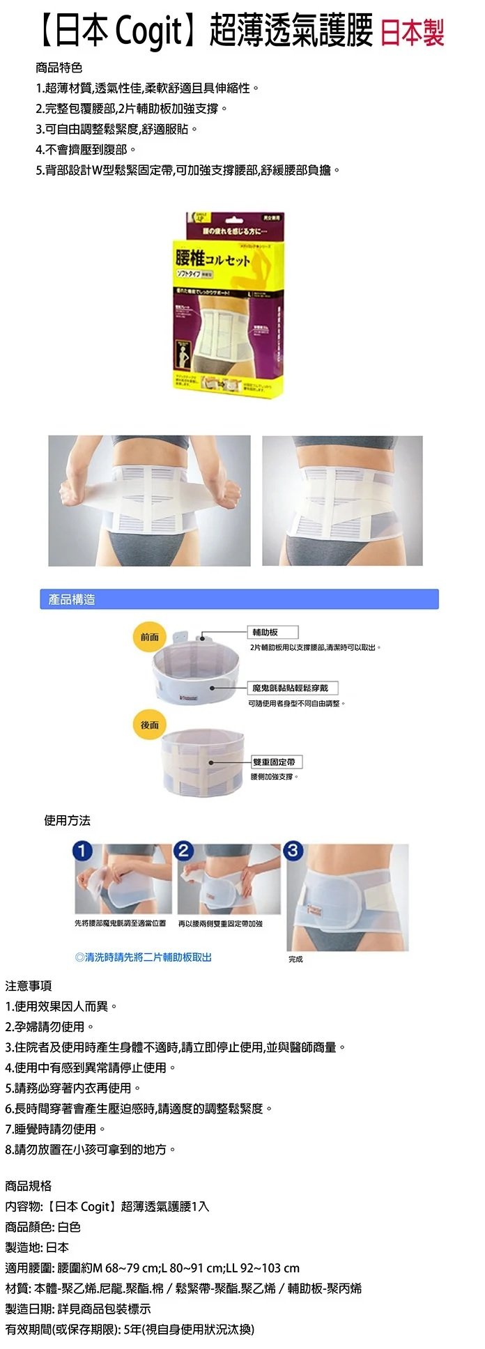 ◆ 適用尺寸:腰圍約M 68~79 cm;L 80~91 cm;LL 92~103 cm