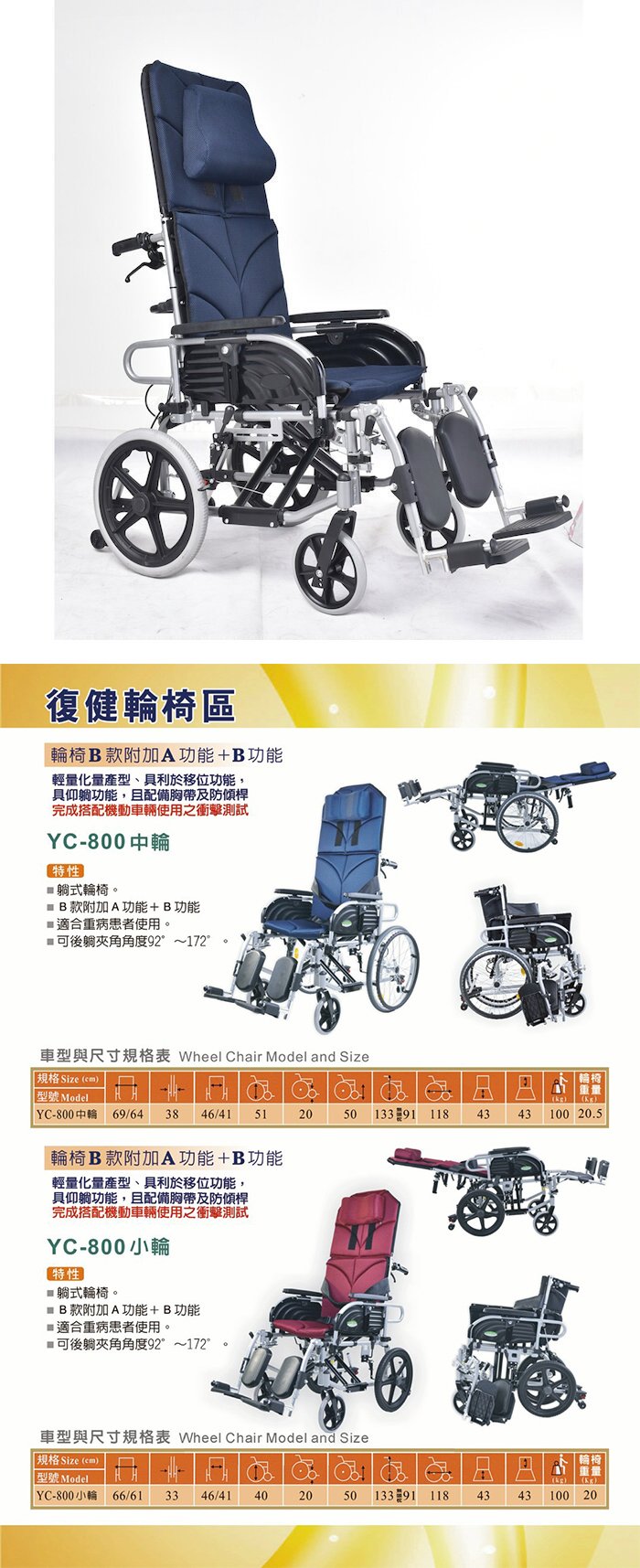 頤辰醫療 機械式輪椅(未滅菌)【海夫健康生活館】16吋輪椅 輪椅B款 附加A功能+B功能 鋁合金/拆手拆腳/仰躺功能 深紅深藍二色可選(YC-800)