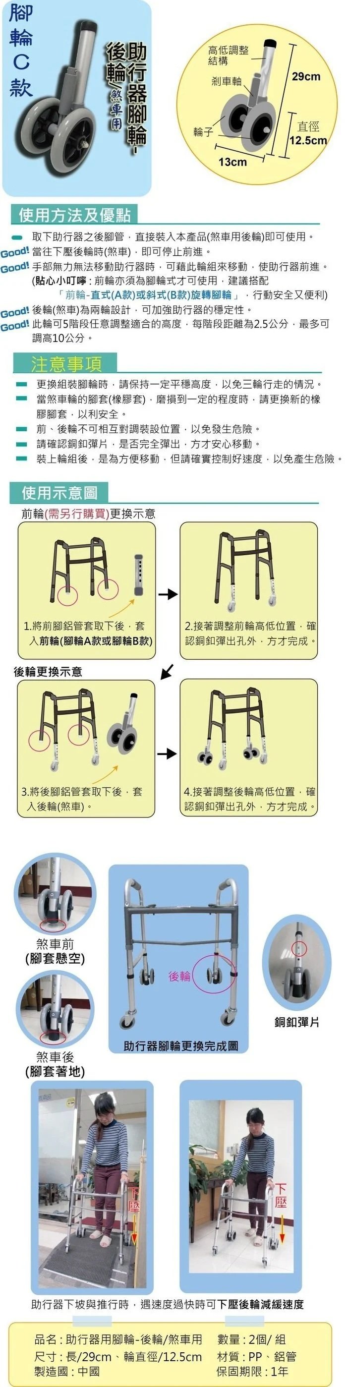產品特性: ◆ 助行器用腳輪B款 前輪使用 斜式旋轉 (2個入/組) ◆ 助行器用腳輪C款 後輪使用 煞車輪 (2個入/組)