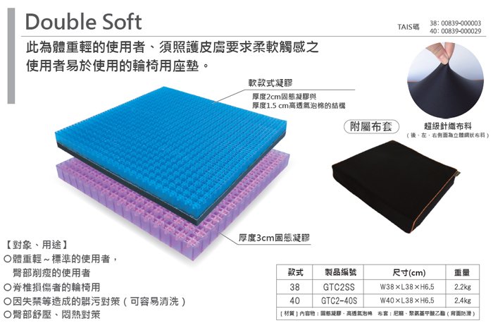 ◆ 品名:【海夫健康生活館】Geltron Double Soft 輪椅用 固態凝膠座墊 附防滑布套(GTC2-40S)