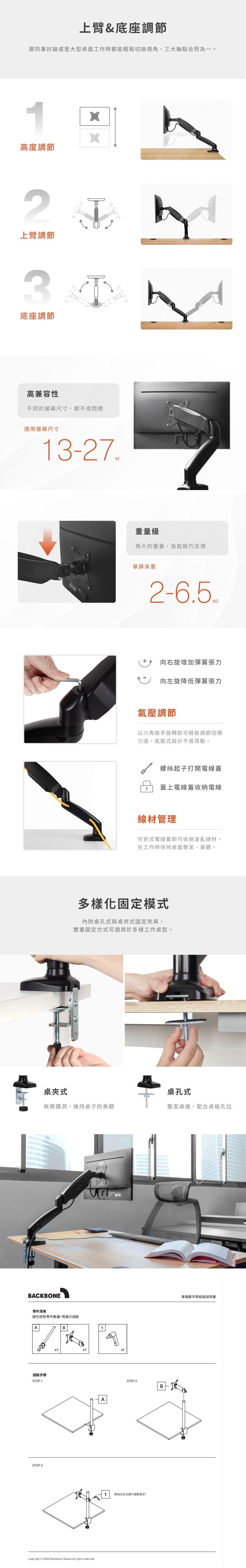 【海夫健康生活館】Backbone Mantis Pro™ 氣壓式單螢幕支架 (桌夾式)