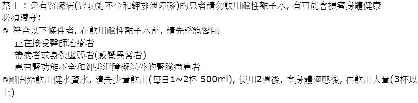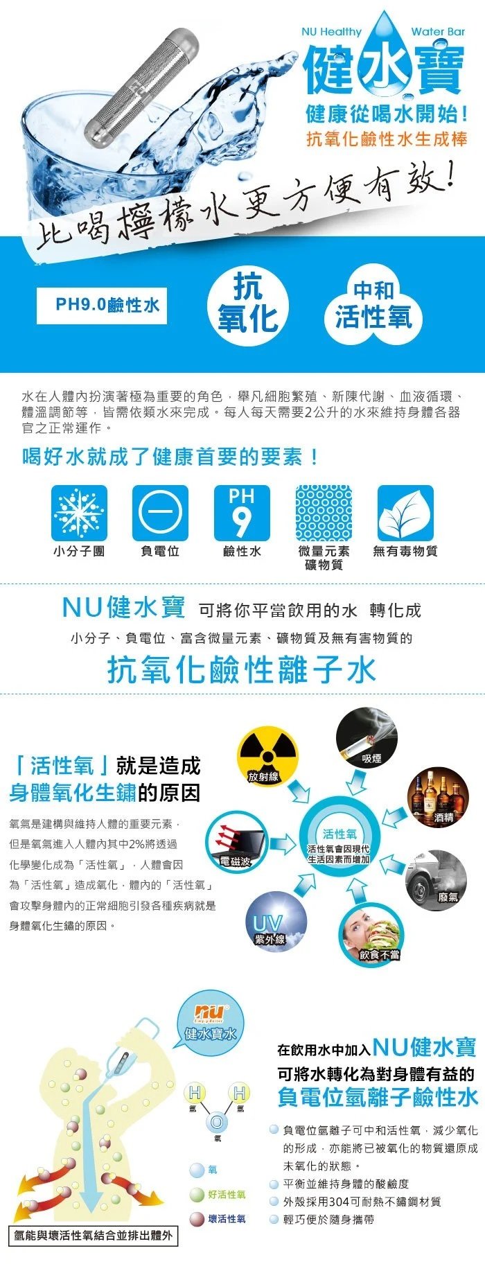 水在人體內扮演著極為重要的角色,舉凡細胞繁殖、新陳代謝、血液循環、體溫調節等,皆需依類水來完成。每人每天需要2公升的水來維持身體各器官之正常運 作。喝好水就成了健康首要的要素!健水寶可將你平當飲用的水 轉化成小分子、負電位、富含微量元素、礦物質及無有害物質的抗氧化鹼性離子水。