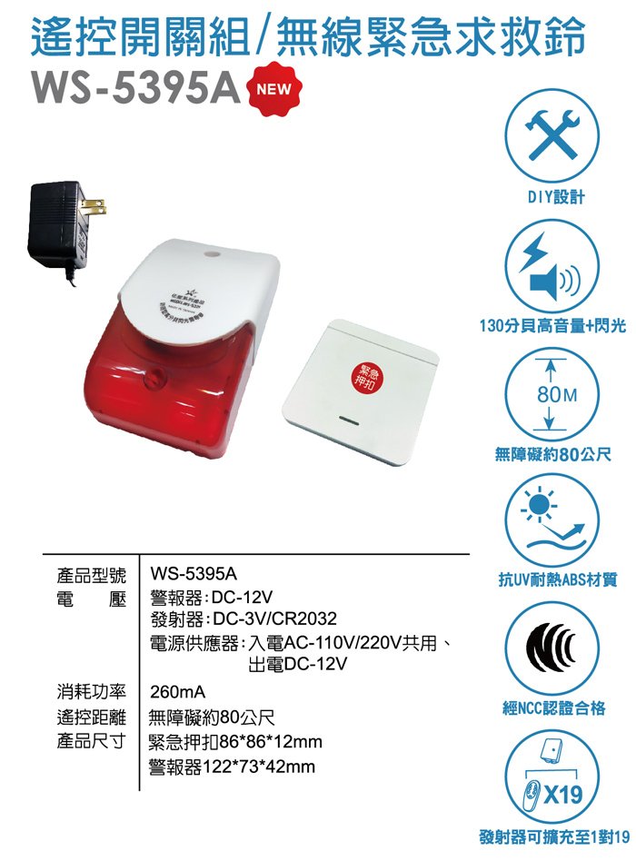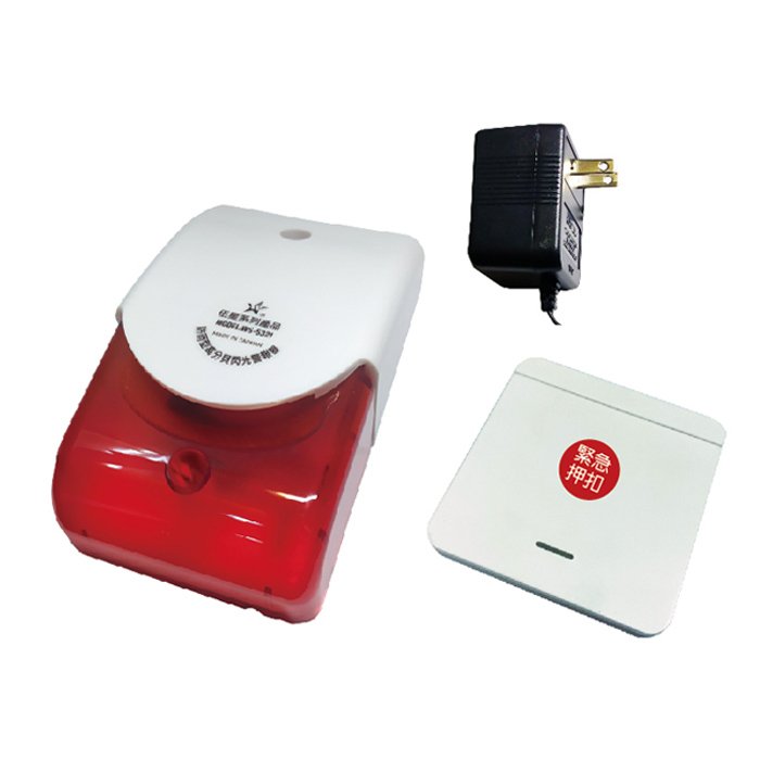 – 警報器:DC-12V,發射器:DC-3V/CR2032電池一只