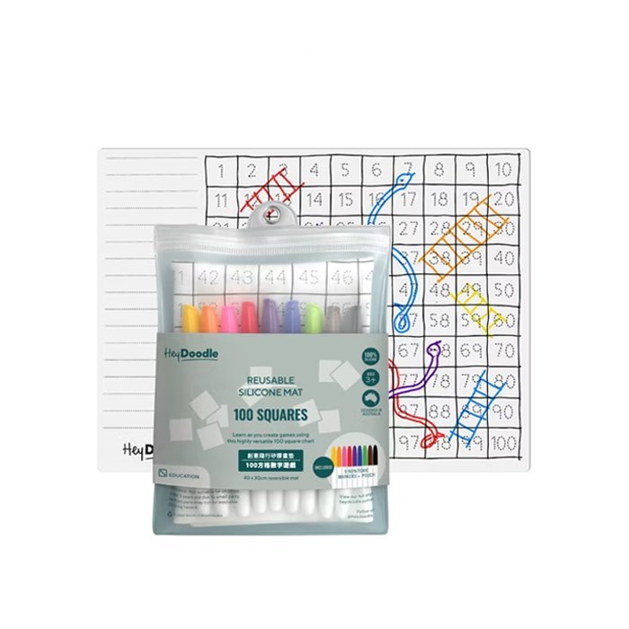 ◆ 可重複使用的A3 尺寸塗鴉畫墊 每張矽膠畫墊皆精心設計 結合教育主題 如恐龍 英文字母 農場動物 數字 100個方格等 讓好奇的孩子們在描繪 塗色的同時也能學習
