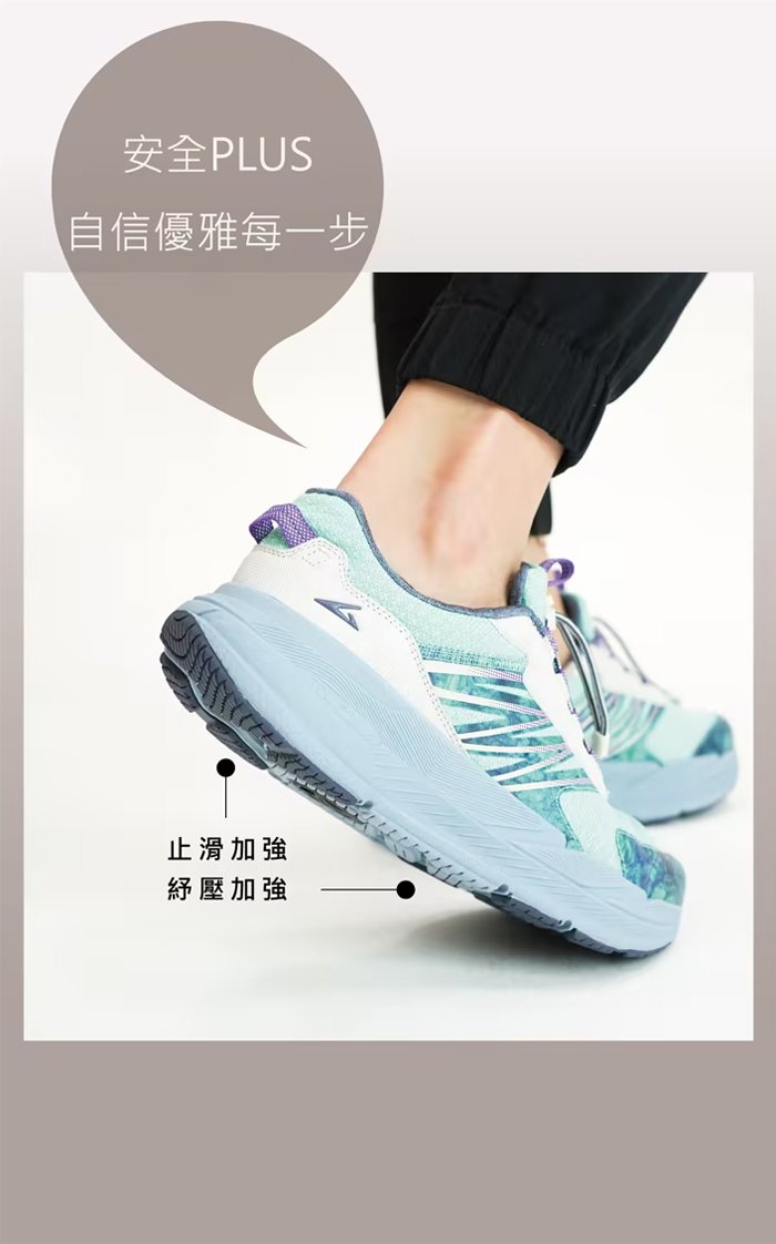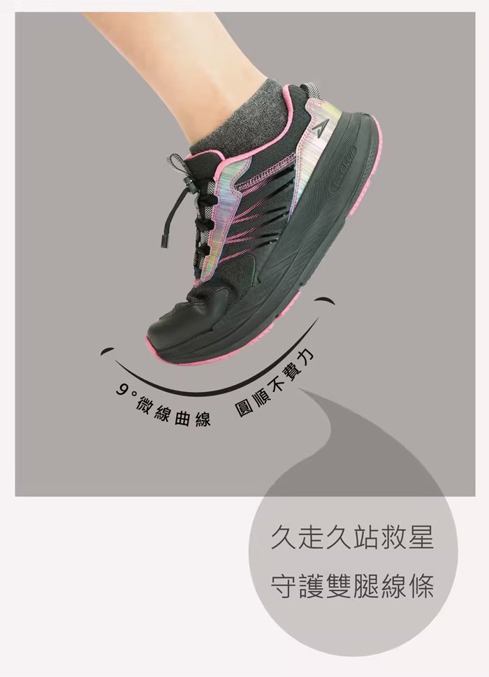 ◆ 360度足弓支撐 寬楦頭與三層鞋底分壓 舒緩足部壓力