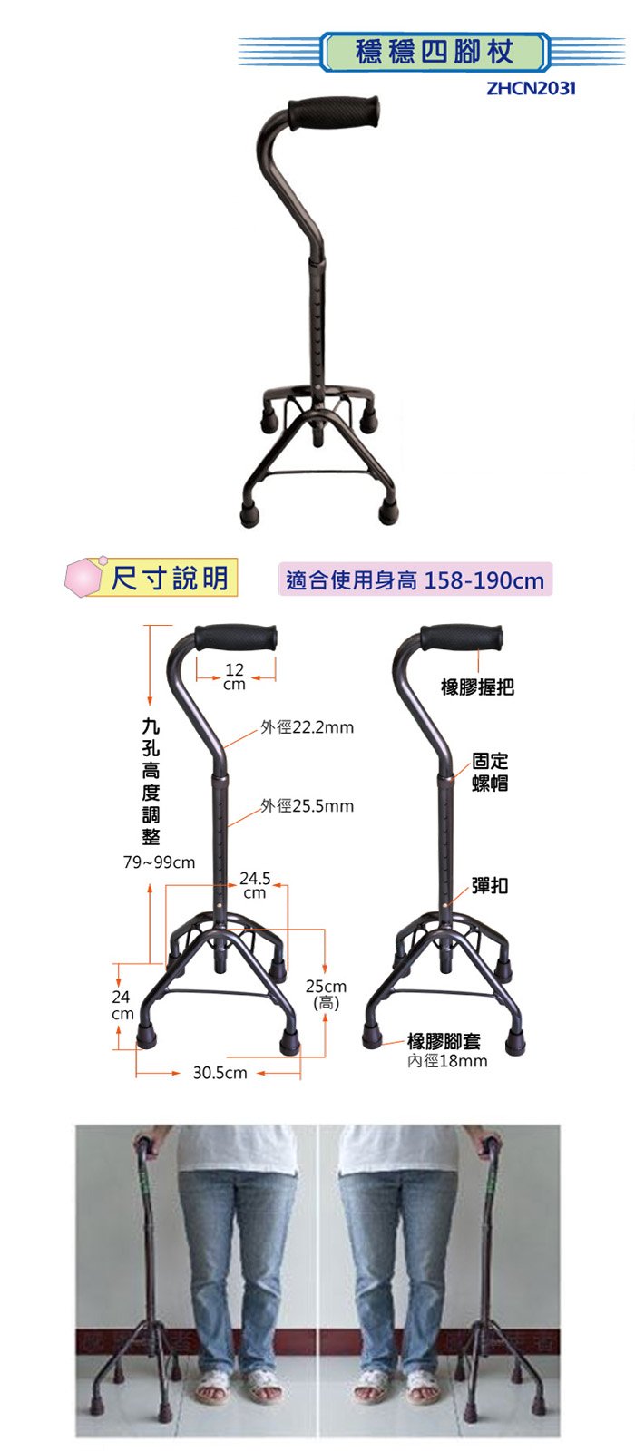 NOVA醫療用手杖(未滅菌)【海夫健康生活館】RH-HEF 鋁合金立式伸縮杖 穩穩四腳杖(ZHTW2031)