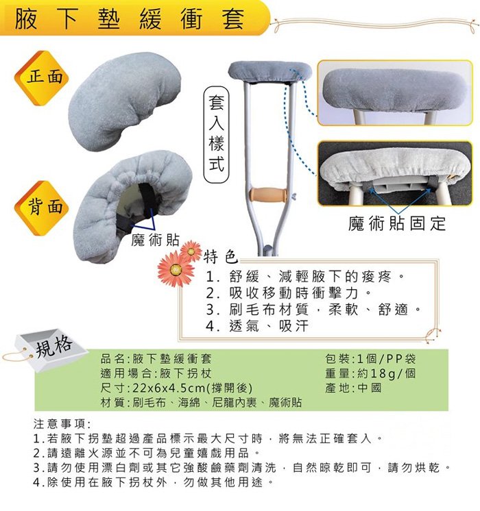 ◆ 使用腋下拐的人們常因腋下處重壓而感到摩擦 疼痛 使用緩衝套可以減緩不適