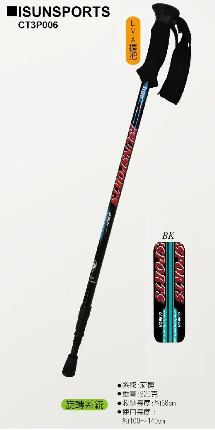 產品規格: ◆ 長度:展開 – 100~140公分,收納 – 68公分 ◆ 材質:碳纖維(杖身)、腳墊(防滑橡膠) ◆ 重量:220克 ◆ 節數:3節 ◆ 系統:旋轉式 ◆ 產地:台灣 ◆ 保固:正常使用,骨架一年保固