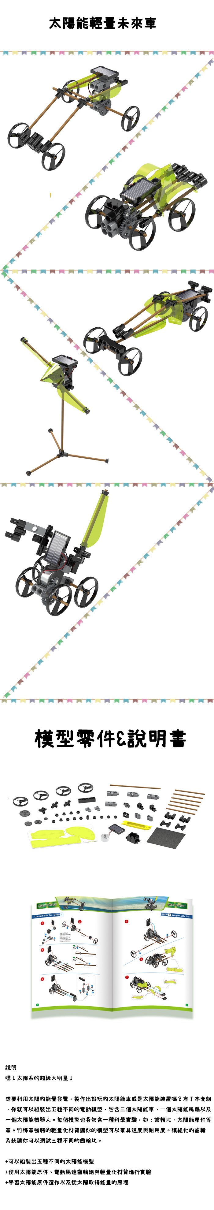 ◆ 可以組裝出 5 個酷炫的太陽能模型 3種不同樣式的太陽能漫遊賽車 太陽能風扇和太陽機器人 甚至能自己發揮創意裝置獨一無二的設備