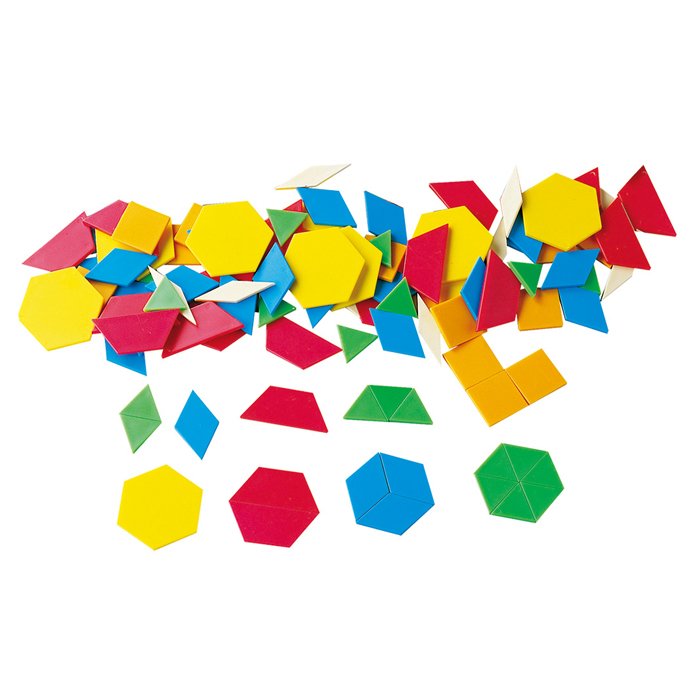 本產品內含三角形、正方形、六邊形等6種不同顏色與形狀的圖案積木,搭配5張雙面工作卡做為引導,