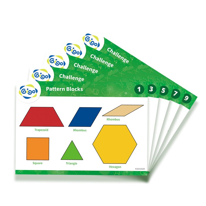 本產品內含三角形、正方形、六邊形等6種不同顏色與形狀的圖案積木,搭配5張雙面工作卡做為引導,