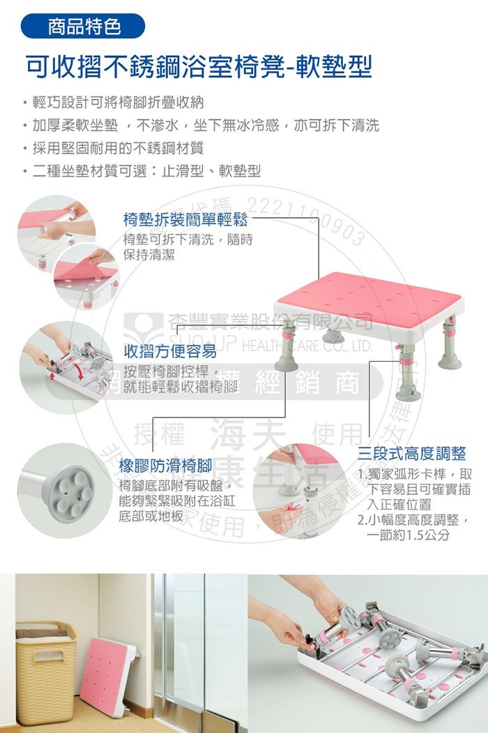 【海夫健康生活館】HEF 日本Richell 可收摺不銹鋼浴室椅凳-軟墊型 粉色(RFA49791)