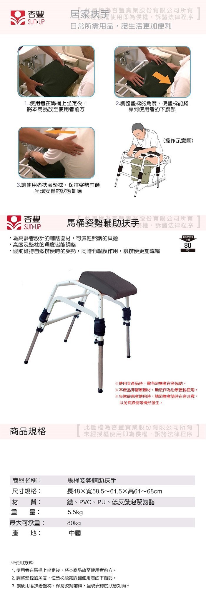 3. 讓使用者扶著墊枕,保持姿墊前傾,呈現安穩的狀態如廁。